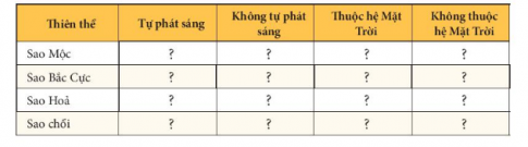 | Thiên thể | Tự phát sáng | Không tự phát sáng | Thuộc hệ Mặt Trời | Không thuộc hệ Mặt Trời |