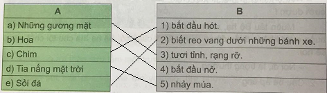 Nối từ ngữ chỉ sự vật ở cột A với từ ngữ tả sự vật đó ở cột B để tạo thành các câu nói về sự thay đổi của vương quốc khi có tiếng cười: