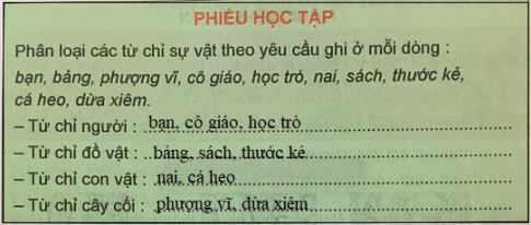 Phân loại các từ chỉ sự vật theo yêu cầu ghi ở mỗi dòng
