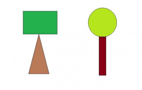 1. Ghép hình cây theo mẫu bằng cách dùng những hình chữ nhật, hình tam giác, hình tròn.