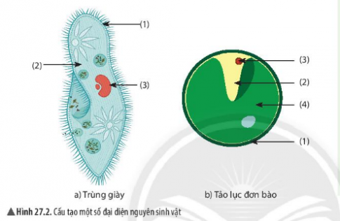 - Nêu đặc điểm cấu tạo nguyên sinh vật bằng cách gọi tên các thành phần cấu tạo được đánh số từ (1) đến (4) trong hình 27.2. Từ đó, nhận xét về tổ chức cơ thể (đơn bào/đa bào) của nguyên sinh vật