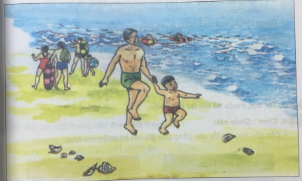 Quan sát bức tranh em thấy, bãi biển rất đẹp, có nước biển xanh, bờ cát vàng. Dưới biển, mọi người đang vui đùa, bơi lội. Trên biển, ông bố dắt tay em bé đi ngắm biển. Nhìn nét mặt em rất vui, dừng như em rất thích thú khi được nhìn thấy biển.