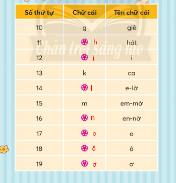 b) Tìm chữ cái thích hợp với ô trống. Học thuộc tên chữ cái trong bảng.