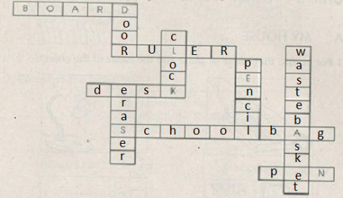4. Write the following words into the boxes: door, schoolbag, ruler, clock, pencil, desk; waste basket; eraser, pen. – Viết các từ sau vào các ô
