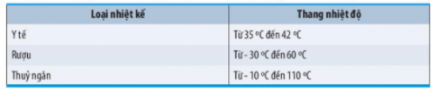 3. Bảng dưới đây ghi tên các loại nhiệt kế và nhiệt độ ghi trên thang đo của chúng: