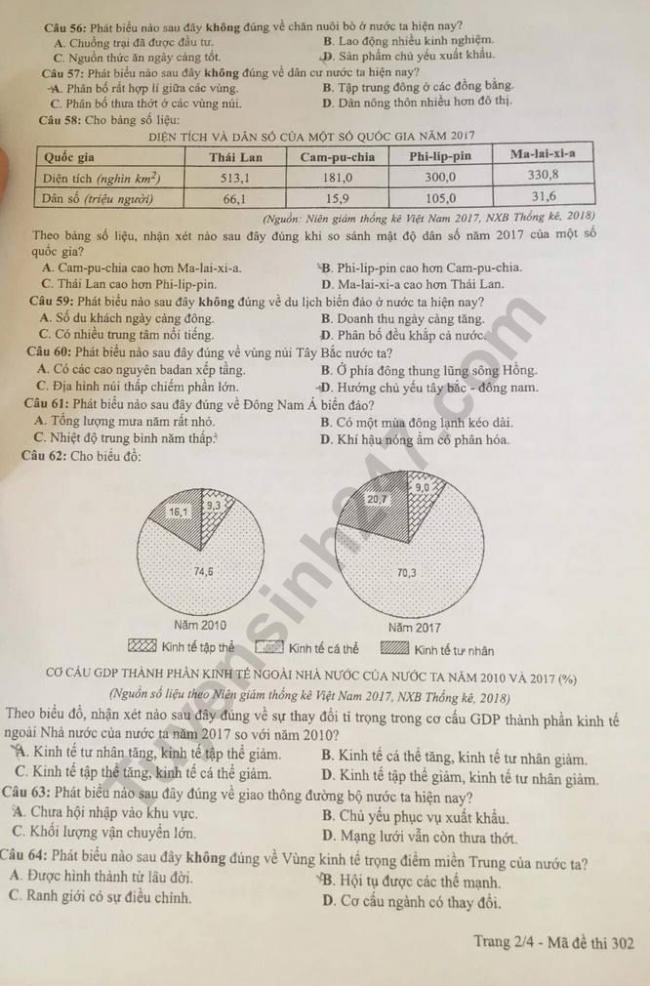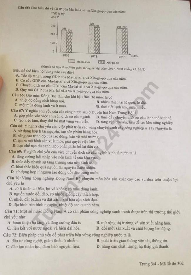 Thi THPQG 2019: Đề thi và đáp án môn Địa lí mã đề 302