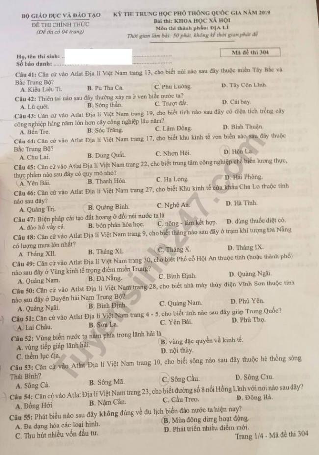 Cập nhật liên tục đề thi và đáp án môn Địa lí kì thi THPT quốc gia năm 2019. Dưới đây, KhoaHoc sẽ gửi đến quý phụ huynh và học sinh đề thi và đáp án môn Địa lí mã đề 304. Mời quý bạn đọc cùng tham khảo.