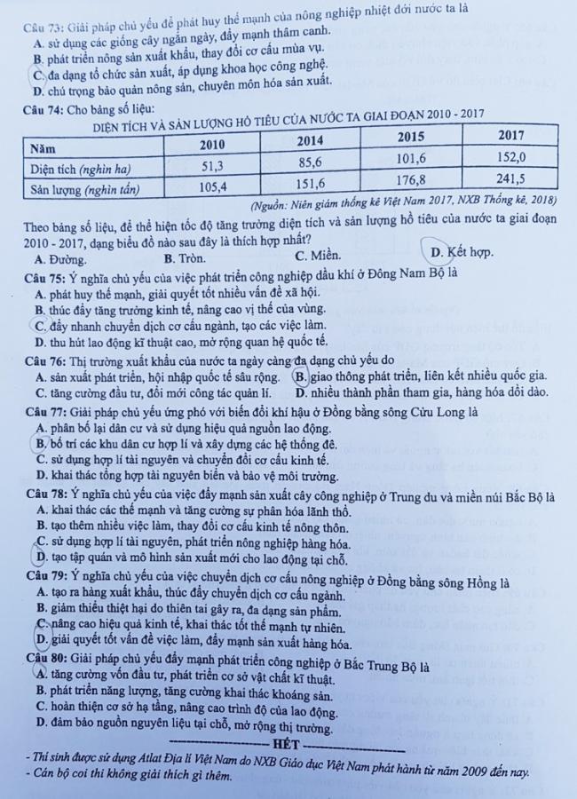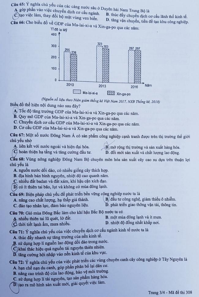 Thi THPQG 2019: Đề thi và đáp án môn Địa lí mã đề 308