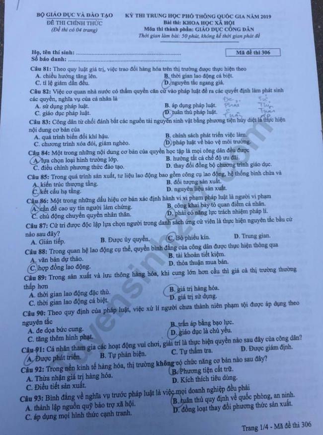 Thi THPQG 2019: Đề thi và đáp án môn GDCD mã đề 306