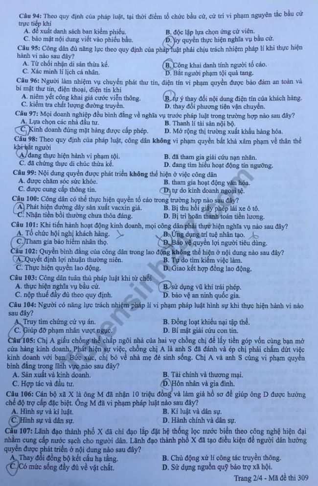 - Đề thi và đáp án môn GDCD: Mã đề 309