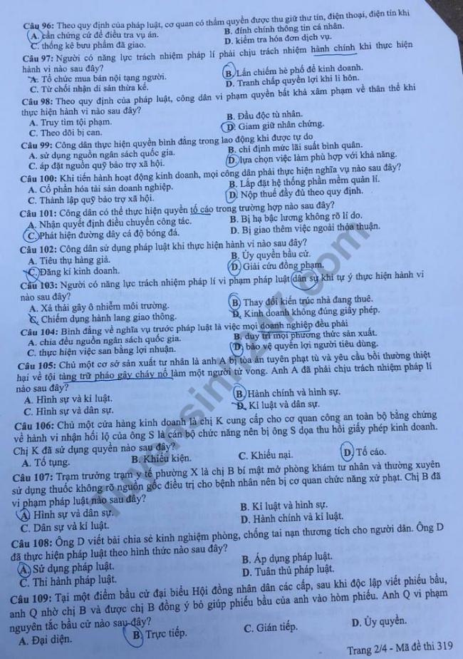 Thi THPQG 2019: Đề thi và đáp án môn GDCD mã đề 319