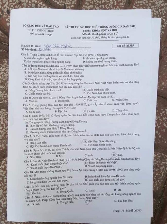 - Thi THPTQG 2019: Đáp án chính thức của Bộ GD môn Lịch sử