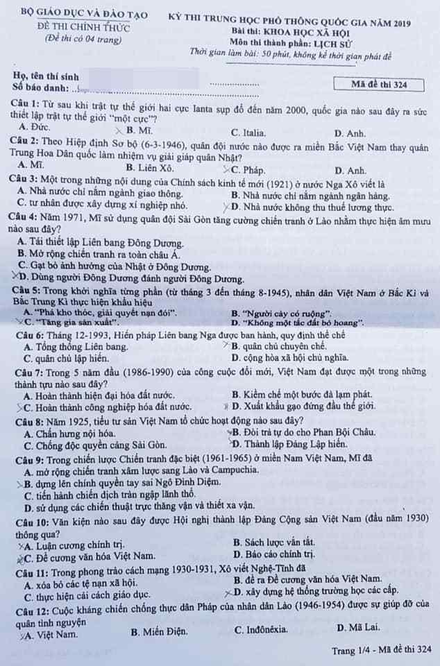 Thi THPQG 2019: Đề thi và đáp án môn Lịch sử mã đề 324