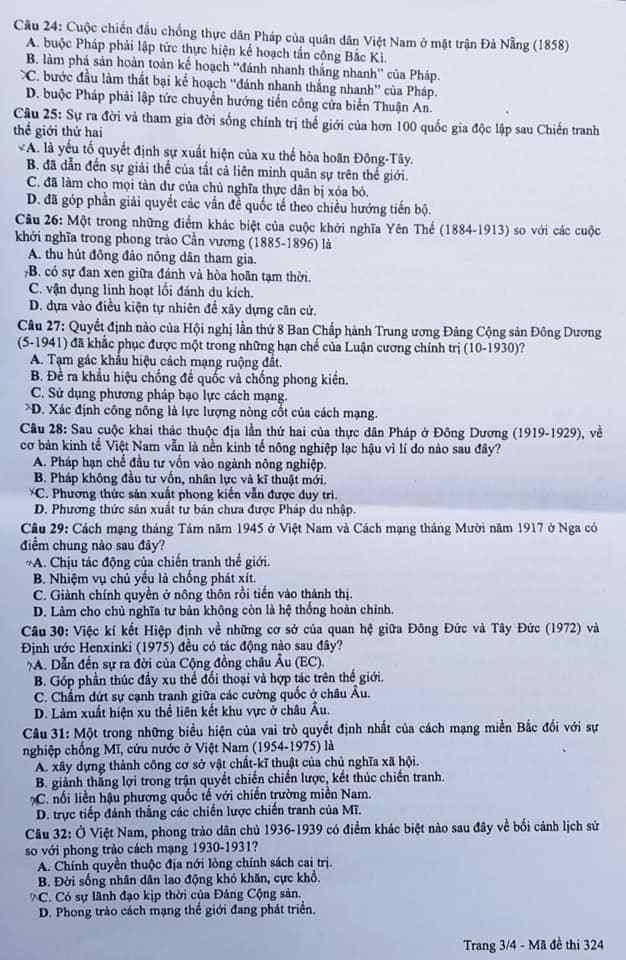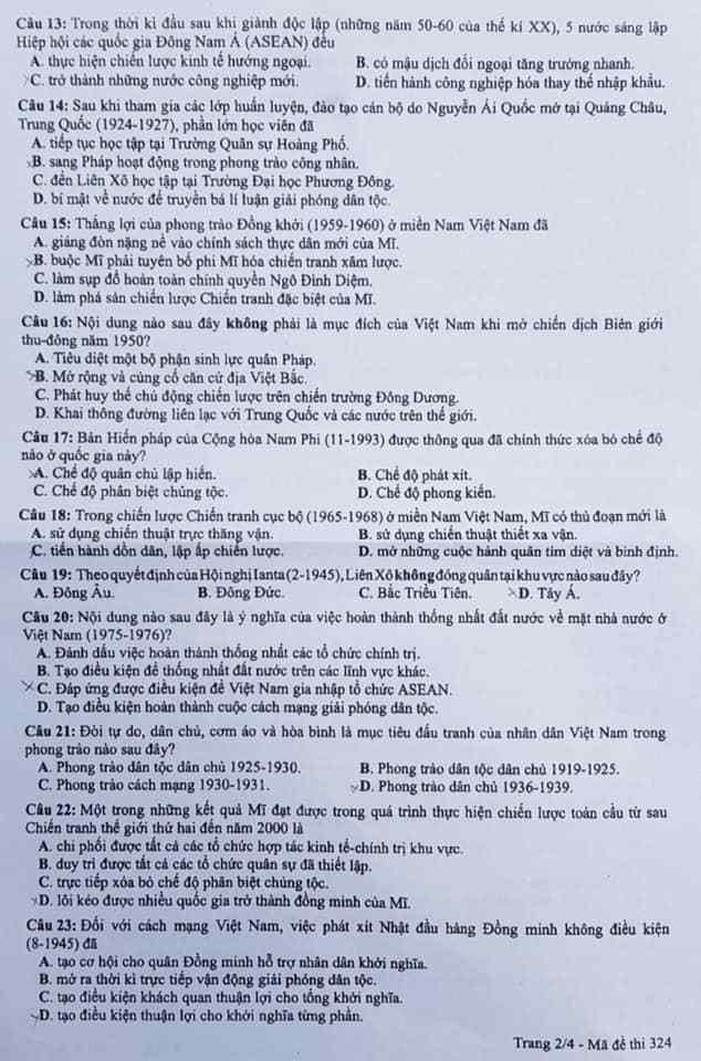 ĐỀ THI MÔN LỊCH SỬ MÃ ĐỀ 324
