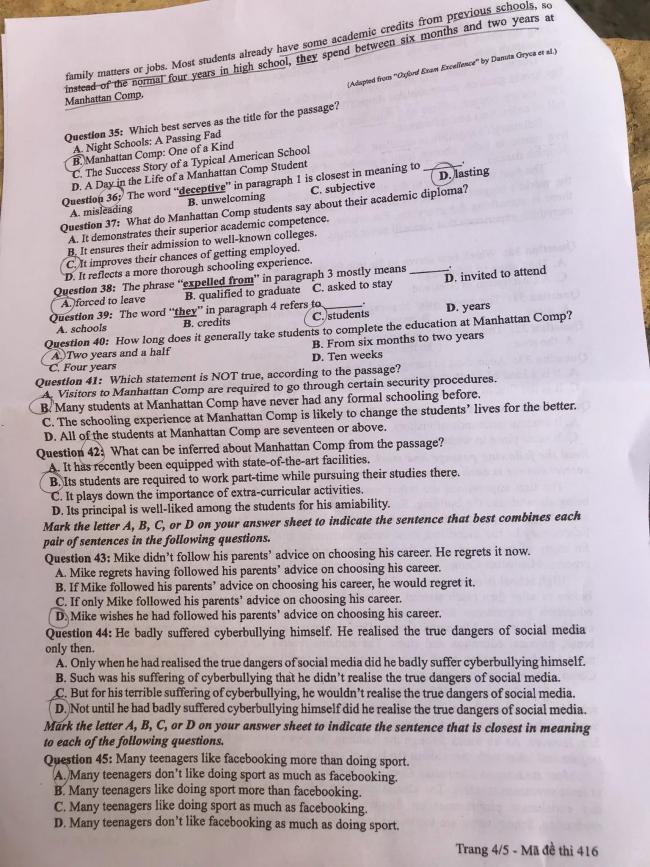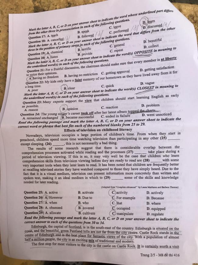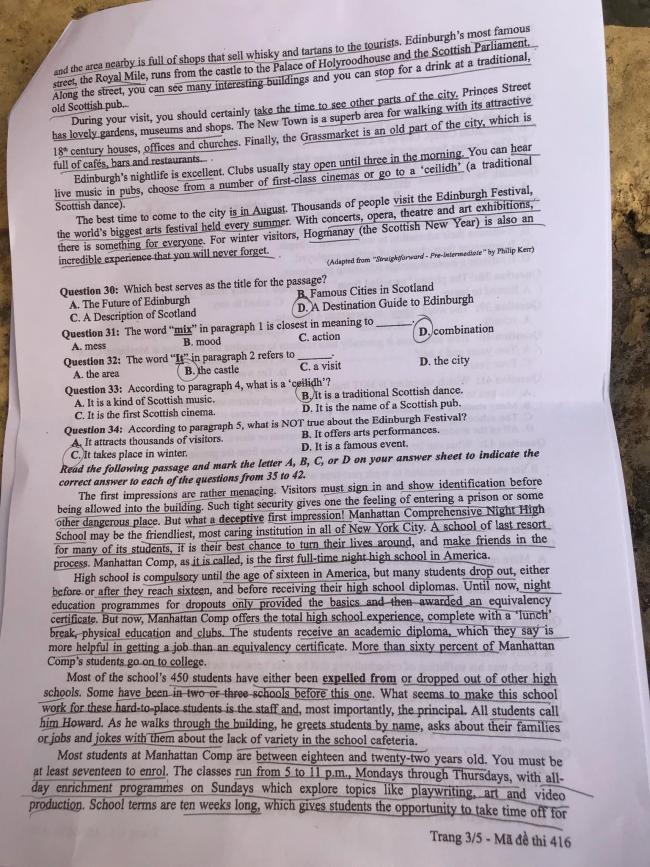- Đề thi và đáp án môn Ngoại ngữ: Mã đề 416