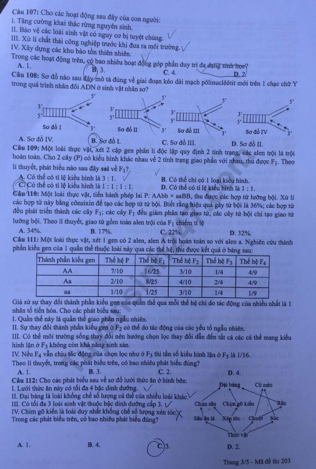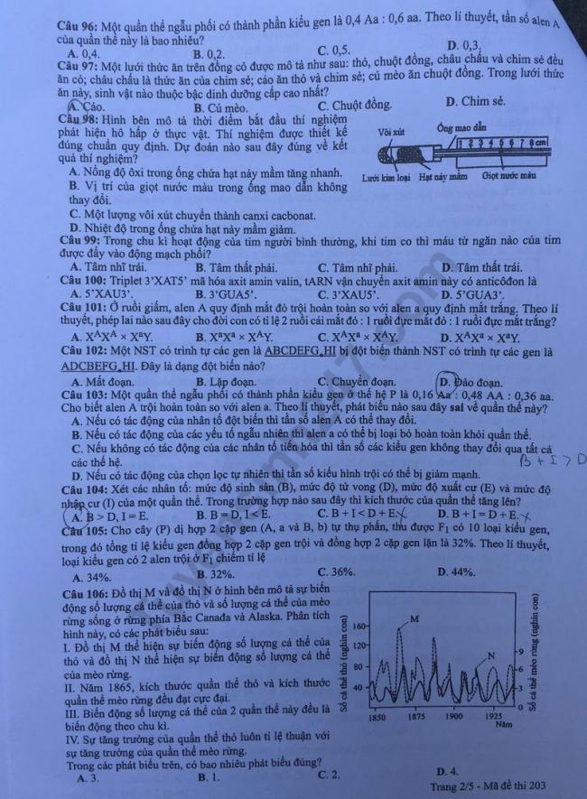 Thi THPQG 2019: Đề thi và đáp án môn Sinh học mã đề 203