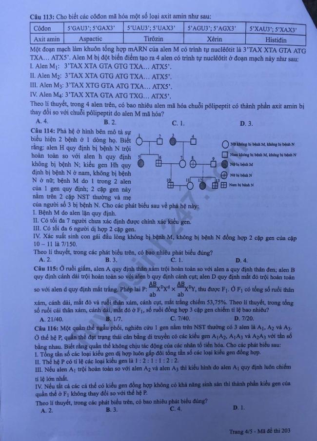 ĐỀ THI MÔN SINH HỌC MÃ ĐỀ 203