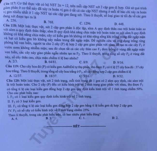 - Thi THPQG 2020: Đề thi và đáp án môn Sinh học mã đề 224