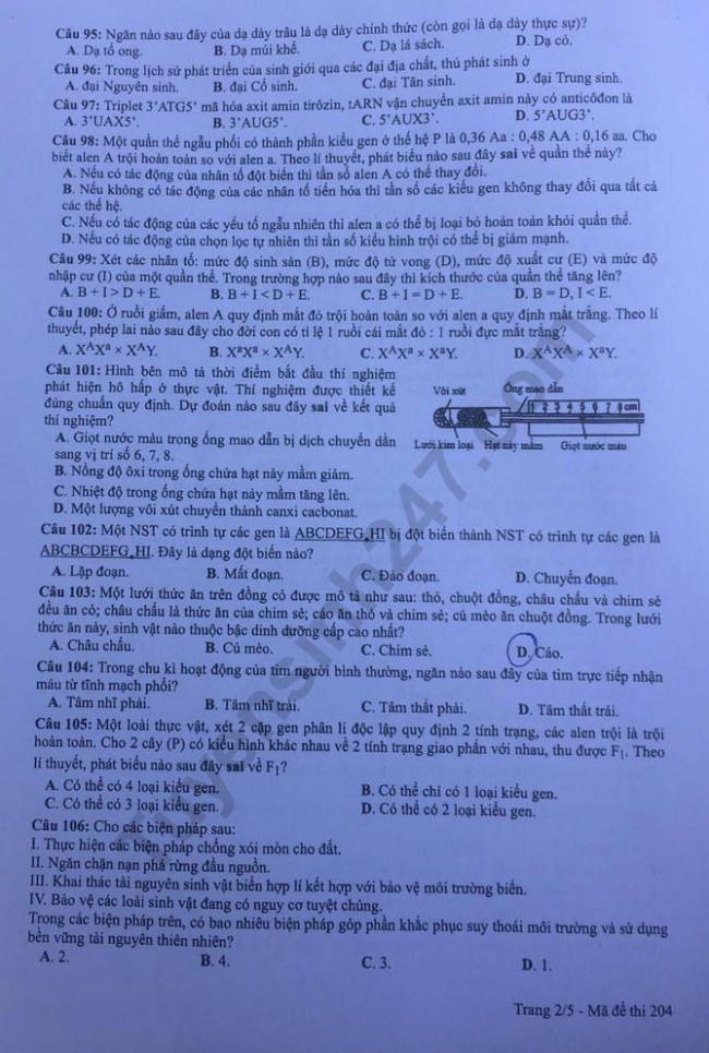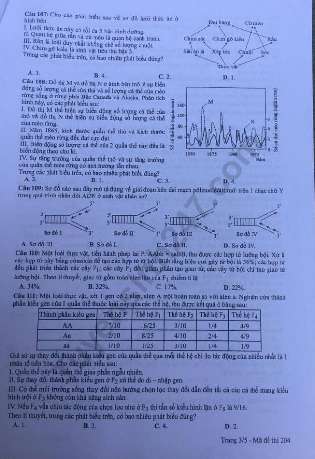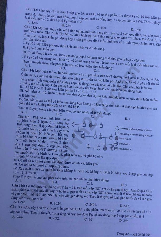- Đề thi và đáp án môn Sinh Học: Mã đề 204