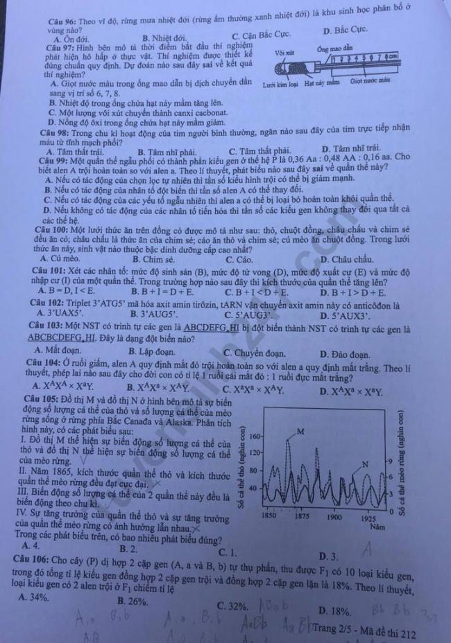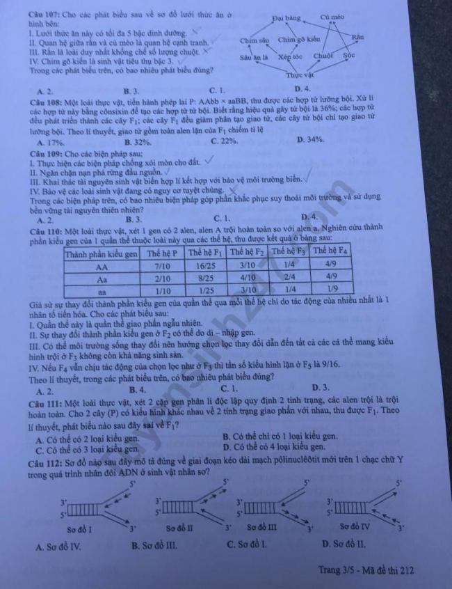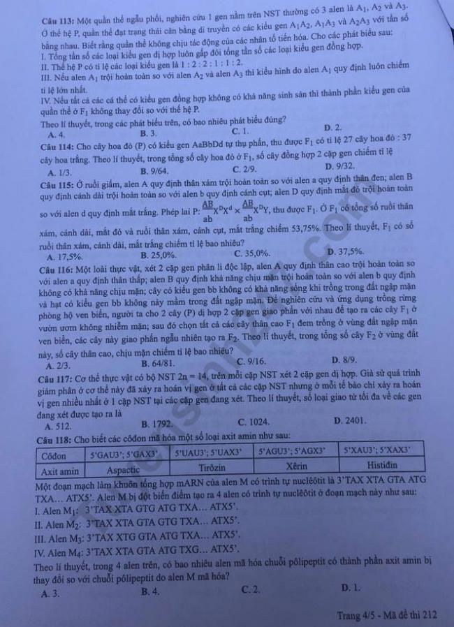 - Đề thi và đáp án môn Sinh Học: Mã đề 212