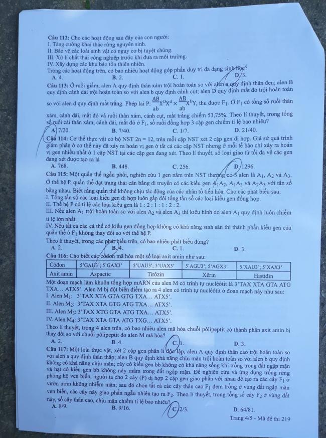 Thi THPQG 2019: Đề thi và đáp án môn Sinh học mã đề 219