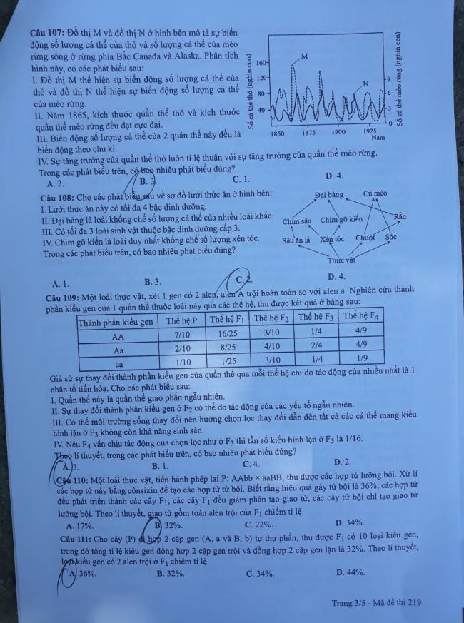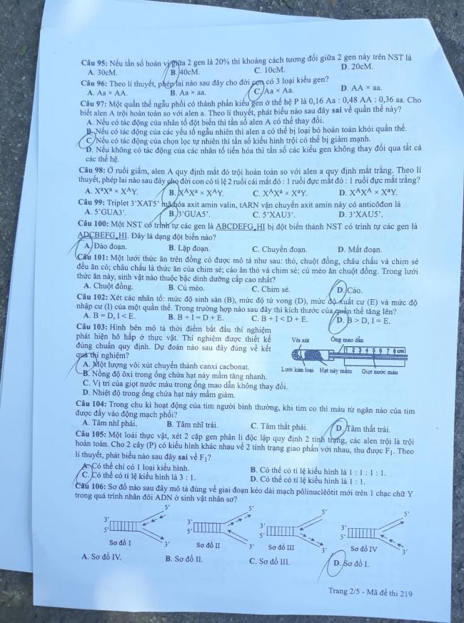 ĐỀ THI MÔN SINH HỌC MÃ ĐỀ 219