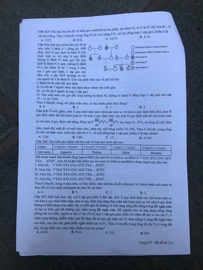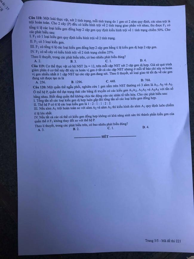 ĐỀ THI MÔN SINH MÃ ĐỀ 221