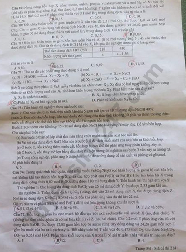 ĐỀ THI MÔN HÓA HỌC MÃ ĐỀ 214