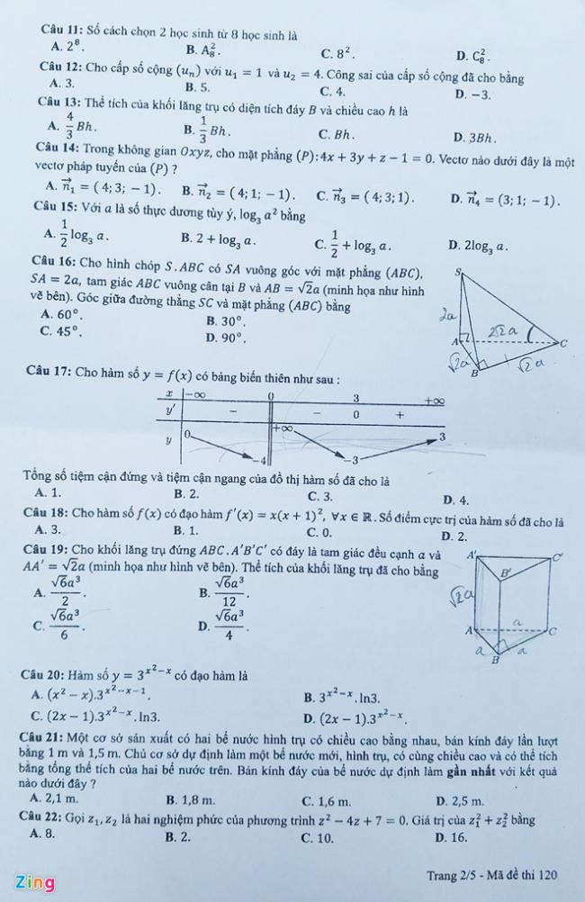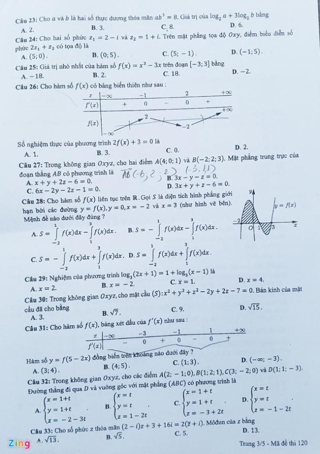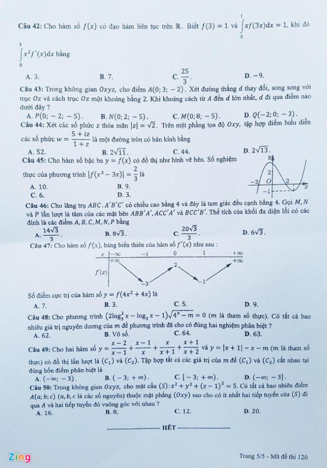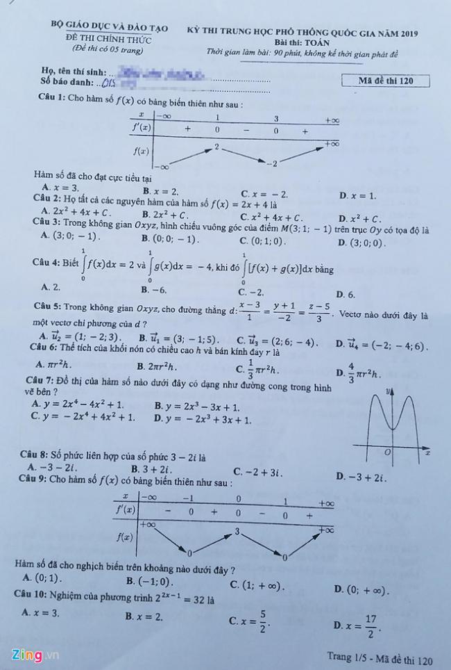 Thi THPTQG 2019: Đề thi và đáp án môn Toán mã đề 120