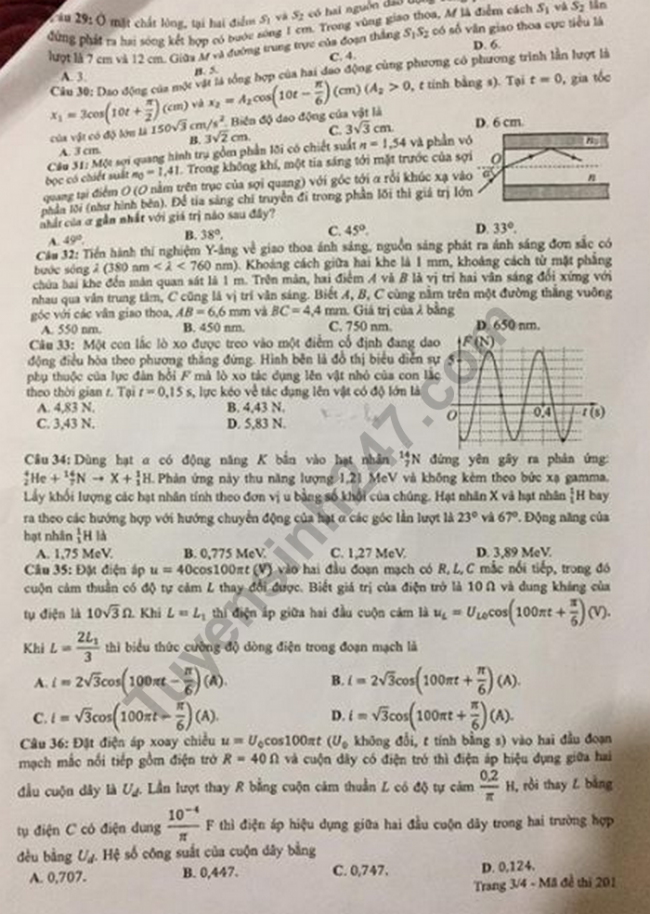 - Thi THPTQG 2020: Đề thi và đáp án môn Vật lý mã đề 201
