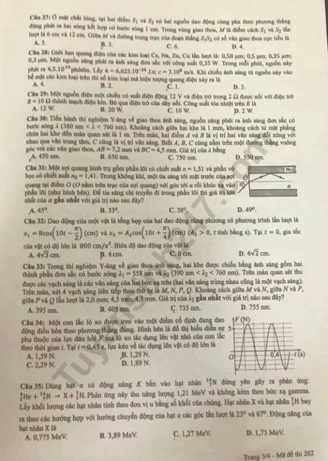 ĐỀ THI MÔN VẬT LÝ MÃ ĐỀ 202