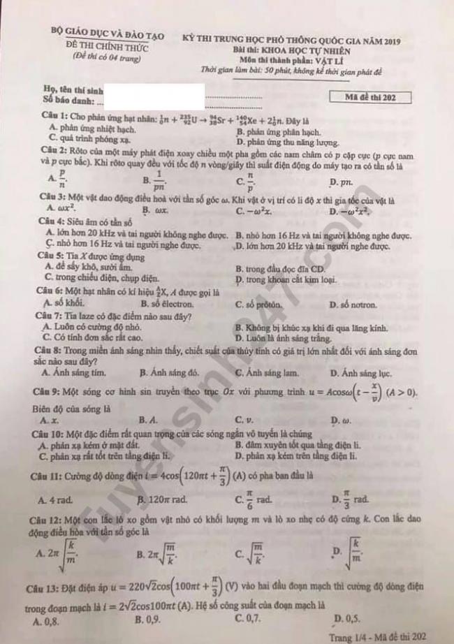 Cập nhật liên tục đề thi và đáp án môn Vật lý kì thi THPT quốc gia năm 2019. Dưới đây, KhoaHoc sẽ gửi đến quý phụ huynh và học sinh đề thi và đáp án môn Vật lý mã đề 202. Mời quý bạn đọc cùng tham khảo.