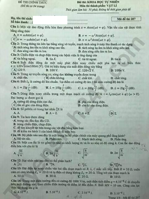 Cập nhật liên tục đề thi và đáp án môn Vật lý kì thi THPT quốc gia năm 2019. Dưới đây, KhoaHoc sẽ gửi đến quý phụ huynh và học sinh đề thi và đáp án môn Vật lý mã đề 207. Mời quý bạn đọc cùng tham khảo.