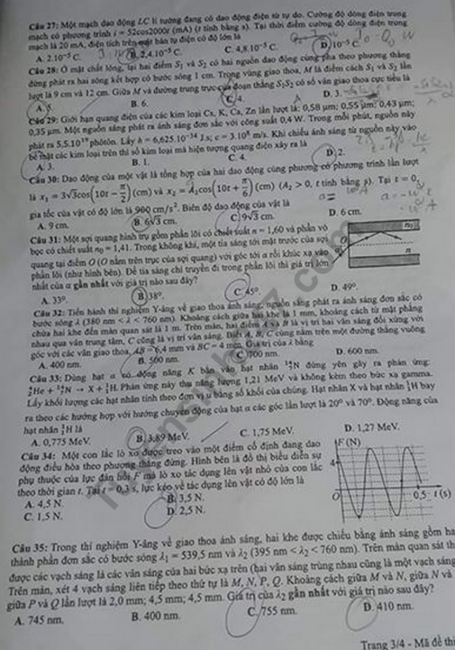 ĐỀ THI MÔN VẬT LÝ MÃ ĐỀ 214