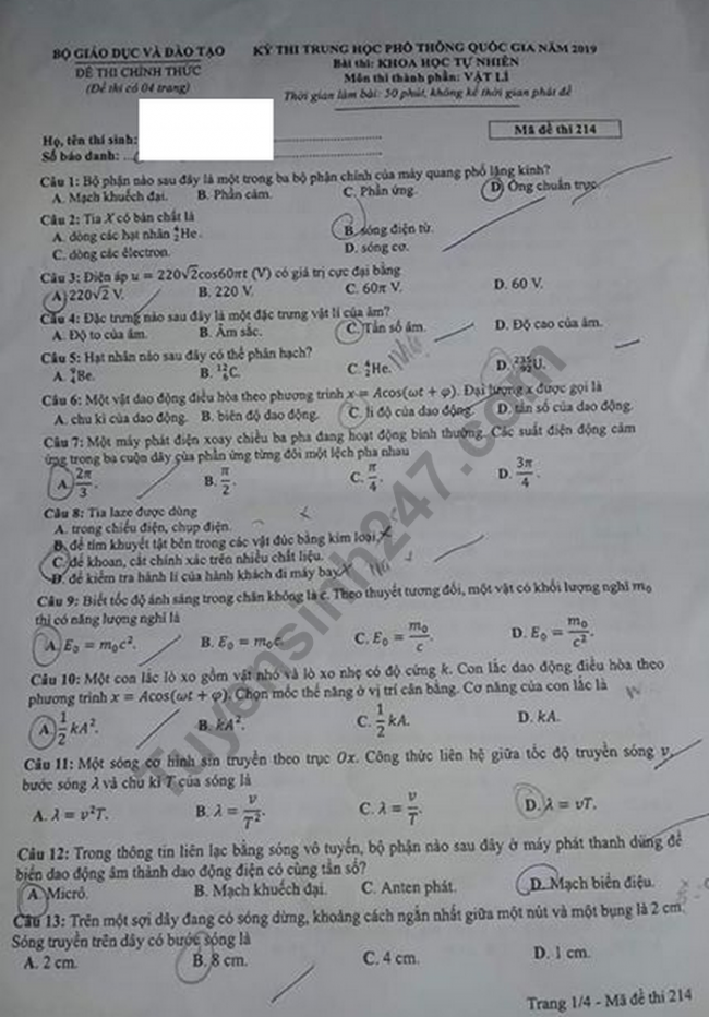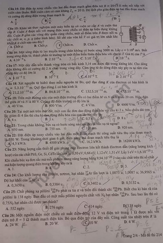 - Đề thi và đáp án: Mã đề 214