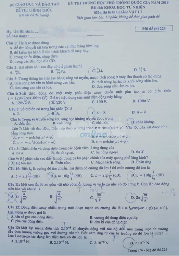 Cập nhật liên tục đề thi và đáp án môn Vật lý kì thi THPT quốc gia năm 2019. Dưới đây, KhoaHoc sẽ gửi đến quý phụ huynh và học sinh đề thi và đáp án môn Vật lý mã đề 223. Mời quý bạn đọc cùng tham khảo.