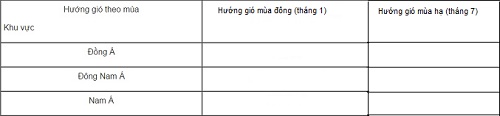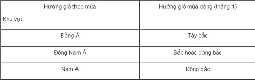 - Xác định các hướng gió chính theo từng khu vực về mùa đông và ghi vào vở học theo mẫu bảng dưới đây: