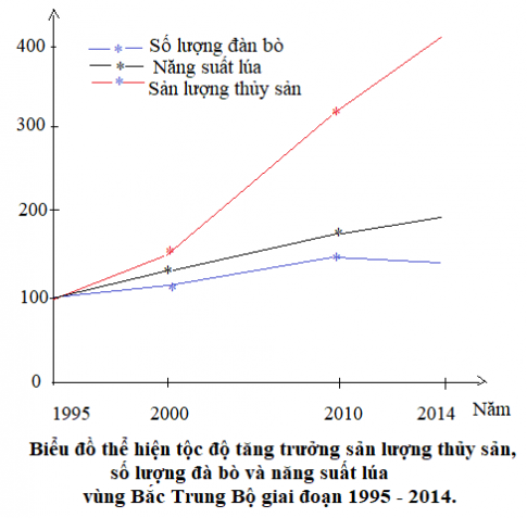 - Vẽ biểu đồ thể hiện tộc độ tăng trưởng sản lượng thủy sản, số lượng đà bò và năng suất lúa vùng Bắc Trung Bộ giai đoạn 1995 - 2014.