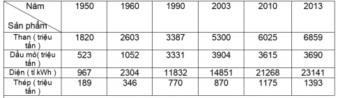 Câu 3: Căn cứ vào bảng số liệu, cho biết sản phẩm nào sau đây có tốc độ tăng trưởng thời kì 1950 - 2003 chậm nhất?