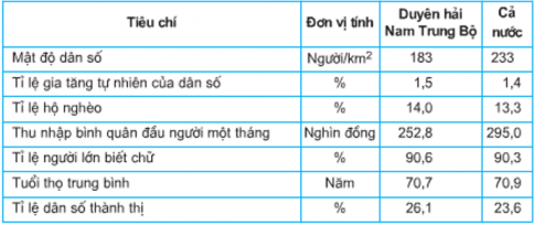 Tiêu chí về dân cư, xã hội ở vùng Duyên hải Nam Trung Bộ thấp hơn mức trung bình cả nước là: