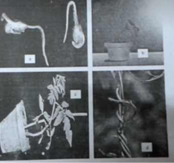 C. a và b là các thí nghiệm đối chứng, c và d là các thí nghiệm tác động của trọng lực lên thân và rễ. 1 – thân và rễ tiếp tục mọc theo hướng nằm ngang, 2 – hướng trọng lực dương, 3 – hướng trọng lực âm