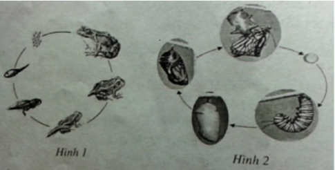 ⦁ ở hình 1, ấu trùng trải qua nhiều lần lột xác và qua giai đoạn trung gian biến đổi thành con trưởng thành ; Ở hình 2, ấu trùng trải qua nhiều lần lột xác biến đổi thành con trưởng thành