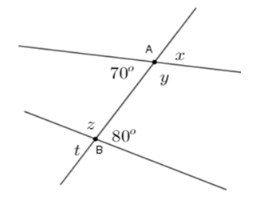 - A. x = 80∘; y = 110∘; z = 100∘; t = 70∘