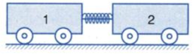 Câu 11: Xe lăn 1 có khối lượng m1 = 400g có gắn một là xo. Xe lăn 2 có khối lượng m2. Ta cho hai xe áp gần nhau bằng cách buộc dây để nén là xo (Hình vẽ). Khi ta đốt dây buộc, lò xo dãn ra và sau một thời gian Δt rất ngắn, hai xe đi về hai phía ngược nhau với tốc độ v1 = 1,5m/s; v2 = 1m/s. Khối lượng m2 là (bỏ qua ảnh hưởng của ma sát trong thời gian Δt).