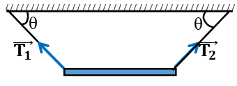 Câu 4: Một thanh đồng chất nằm cân bằng ở tư thế nằm ngang bởi hai sợi dây buộc vào hai đầu của nó như hình vẽ. Lực căng dây có độ lớn T1 = T2 = 10 N, góc θ = 37