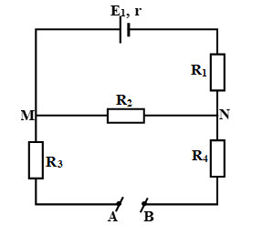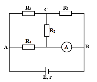 Cho mạch điện như hình vẽ, bỏ qua điện trở của dây nối R1 = 3Ω; R2 = 6Ω, R3 = 4Ω, R4 = 12Ω; E = 12V, r = 2Ω, RA = 0.