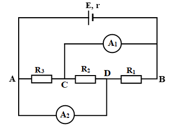 Cho mạch điện như hình vẽ, bỏ qua điện trở của dây nối và các ampe kế, biết R1 = 2Ω, R2 = 3Ω, R3 = 6Ω, E = 6V, r = 1Ω