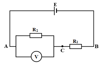 Câu 10: Cho mạch điện như hình vẽ, E = 3V, điện trở trong không đáng kể, bỏ qua điện trở của dây nối, vôn kế có điện trở RV = R1 = R2 = 50Ω. Số chỉ của vôn kế là