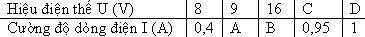Câu 11: Một dây dẫn được mắc vào hiệu điện thế 8 V thì cường độ dòng điện chạy qua nó là 0,4 A. Quan sát bảng giá trị hiệu điện thế và cường độ dòng điện sau đây và cho biết giá trị nào của A, B, C, D là không phù hợp?