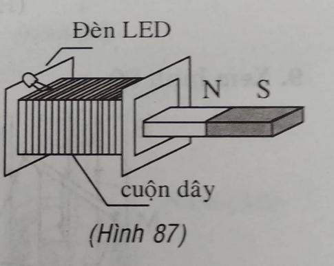Câu 3: Cho một cuộn dây dẫn mà hai đầu nối với bóng đèn LED và một thanh nam châm vĩnh cửu. Bố trí thí nghiệm như hình 87. Khi đưa nam châm vào trong lòng cuộn dây thì thấy đèn LED sáng. Thông tin nào sau đây là đúng?
